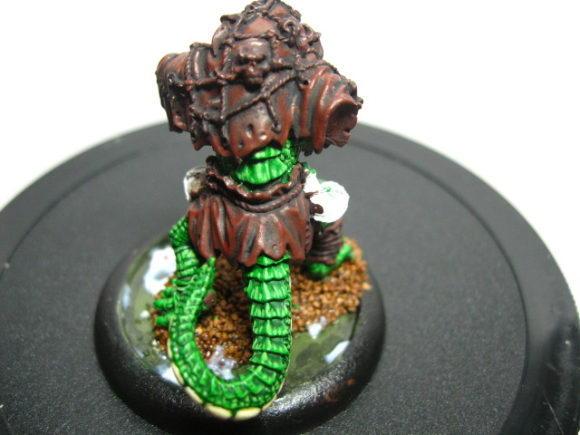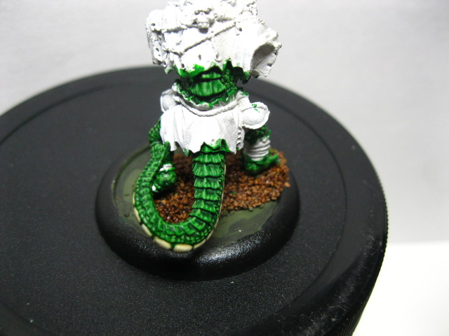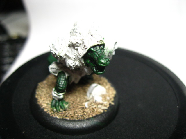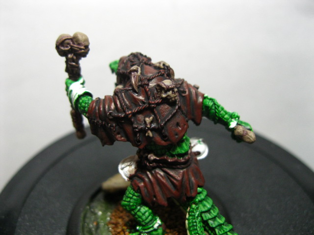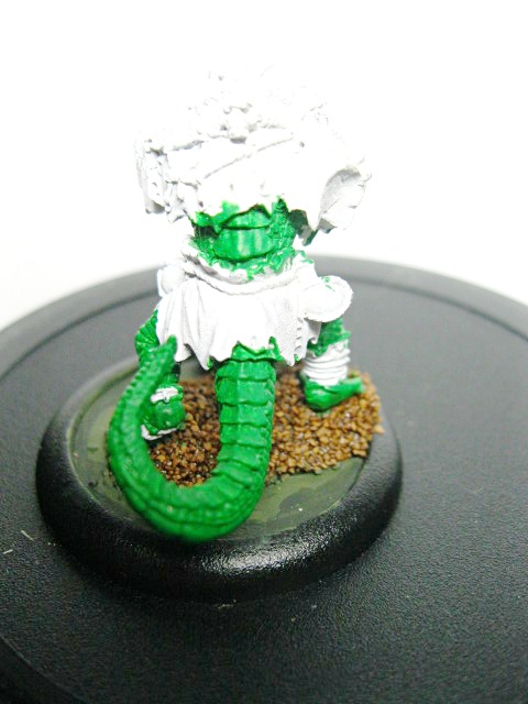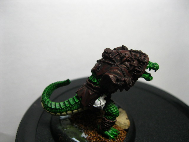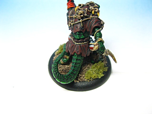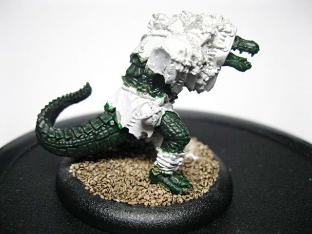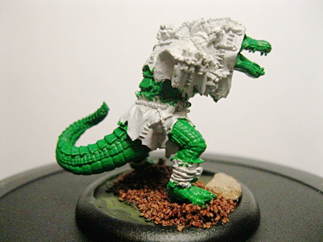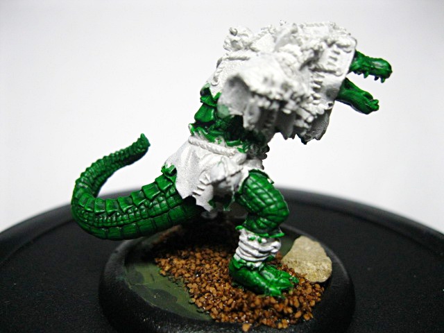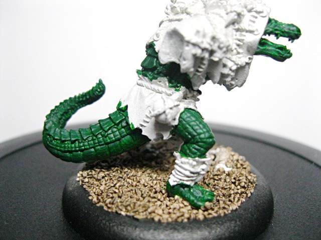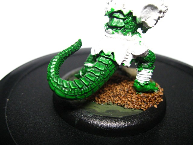For the darker Gatorman I did a final highlight of 2:1 Snot Green and Goblin Green. Be careful how much of that Goblin Green you add to your mix. It really doesn’t take much to lighten that mixture up to a good highlight and you don’t want it to get to stark.
