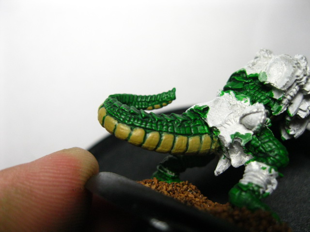There are sooooo many ways that one could use on the scales for these shamanistic lizards. Some might approach it with a dry brushing technique, but I chose to do hardline highlighting. I made sure to feather the different colors onto the top of the model, on the larger scale plates, but for the smaller scales on the legs, arms, and sides, I just added the highlight layers to reflect the overhead light source. Again in this step I started with the lighter of the two models. For this fine fellow’s scales I started with a mid-tone of Snot Green.