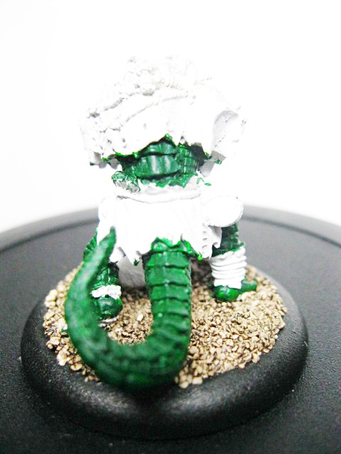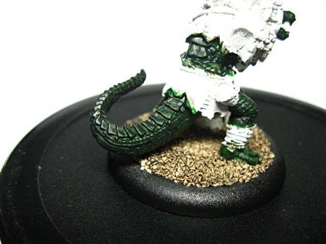 As with the underbelly, I stopped with a second layer of highlighting on both of these models. You will find that if you try to do more than that, you will simply begin covering over previous layers, causing your highlights to become too contrasting. You simply don’t have enough room on those small scales to put more than two layers. For the lighter Gatorman I used a final highlight of straight Goblin Green.