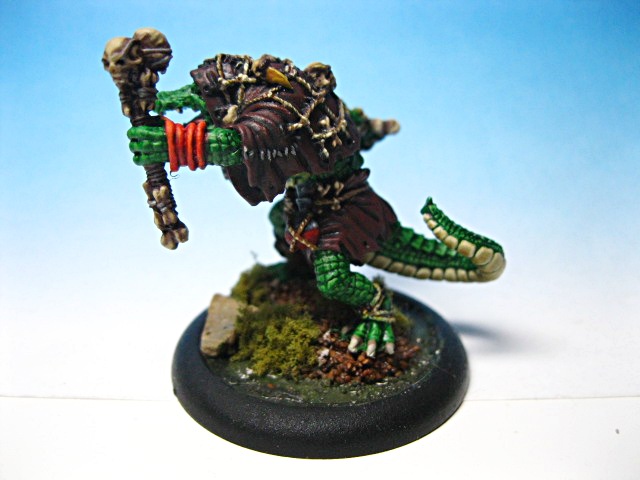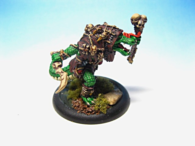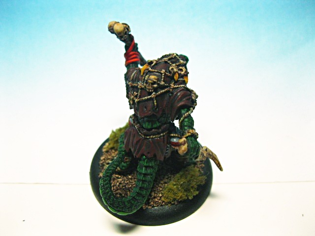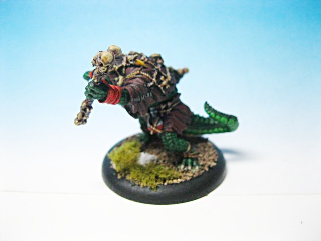 Well ladies and gents, here is the first of what I hope to be a semi-regular feature on the site, Step-by-Steps by yours truly! One of the big projects that I have been working on recently has been a large number of Hordes Minions models for my current commissioner. One major surface areas you run into when working on this particular army is the multitude of scales these nasty lizards have. I also realized when I started my pre-planning for the models that it would be incredibly easy for all of the models to come out looking very similar, providing little contrast on the table-top. I had a block of three Gatormen Witch Doctors as part of this lot, one I painted in an albino scheme which I wont be covering in this tutorial, but the other two I wanted to do in various shades of green. My ultimate goal was to have the three models tied together by the details, i.e. leather cloaks and skulls and armaments, but to have each one having a very different skin color when standing next to each other. So here we go! As I side note I am mostly working with old Citadel paints so those will be the ones I refer to in this article. I found a really handy paint comparison chart over on DakkaDakka sometime ago which could be useful for you folks using different brands of paint. You can find that chart here.