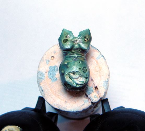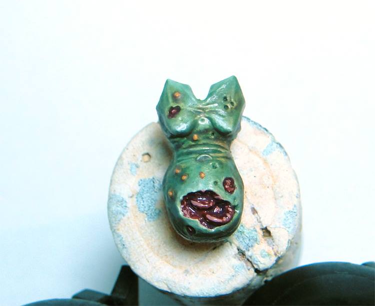 Step 3: Take your shade color (in my case, a mix of that same green and some old Vomit Brown) and apply similarly controlled washes, this time washing only in the shaded areas. If necessary, thin the wash to a glaze and glaze over some mid-tones of the model as well to add depth.